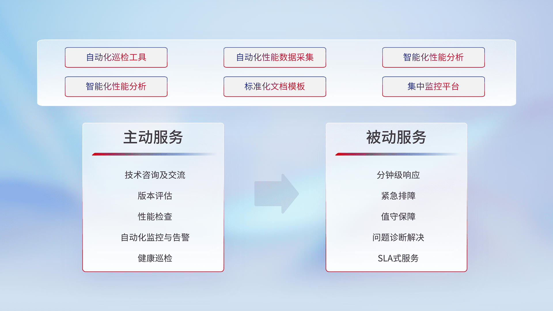 智能化工具和标准化文档,,保障服务质量,,提供主动服务(包含技术咨询、、版本评估、、性能检查、、、自动化监控与告警、、、、健康巡检)和被动服务包含(分钟级响应、、、、紧急排障、、值守保障、、问题诊断解决、、、、SLA服务)。。